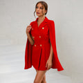 Striking the perfect balance between elegance and boldness, this cape blazer mini dress is designed for women who command attention with confidence. Tailored to flatter the silhouette, it features a waist-accentuating belt and a flowing cape that adds dramatic flair. Gilded button detailing and structured shoulders complete the look, offering a refined yet powerful presence ideal for special occasions. Whether styled for a gala or an evening event, it ensures a poised, unforgettable impression.