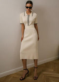 Designed for effortless sophistication, this polo-style knit dress features a structured collar, subtle button detailing, and a fluid midi-length silhouette that flatters the figure. Crafted with a soft, lightweight knit, it transitions seamlessly from casual to elevated settings.