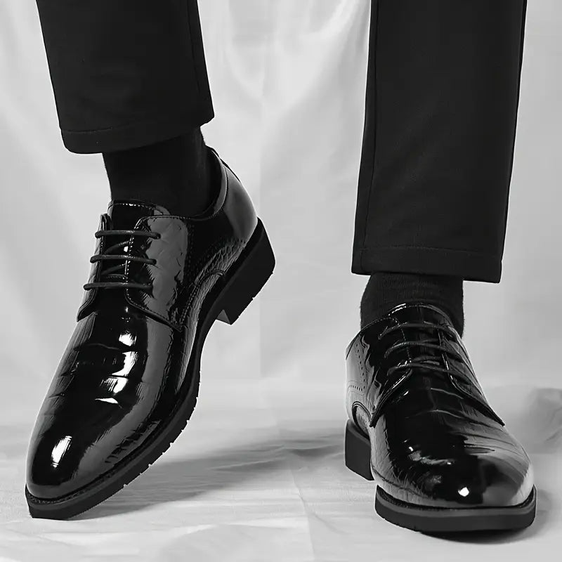 A sleek pair built for distinction, these patent Oxfords feature a polished gloss finish with refined lace-up closure and discreet brogue-inspired detailing. The structured silhouette is balanced by a thick, supportive sole, offering both elegance and durability for long wear. Perfectly suited for business, evening functions, and formal occasions, they bring sharp sophistication to any tailored ensemble.