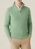 A refined half zip jumper with classic cable texture. The zip adjusts from neat crew to stand collar in seconds, giving easy warmth control, while the dense knit feels soft without bulk. Ribbed cuffs and hem hold their shape, and the regular fit layers smoothly over an Oxford shirt for desk to dinner.