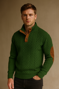 Men’s Knitted Sweater – Classic Jacquard Design with Button Collar and Elbow Patches