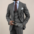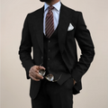 Precision tailoring meets modern authority in this refined three-piece suit. The single-breasted blazer, coordinating waistcoat, and sharp trousers create a streamlined silhouette that commands respect in every setting.
