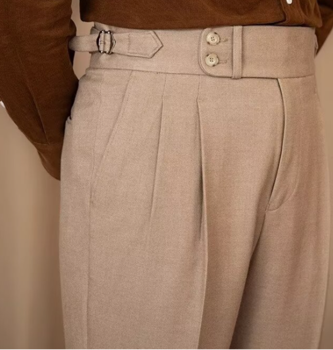 Design: Tailored trousers with side tabs and front pleats