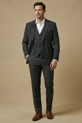 Created for occasions where presence matters, this refined three-piece delivers a confident, well-balanced silhouette from every angle. The structured jacket sharpens the frame, the fitted waistcoat adds depth and polish, and the streamlined trousers complete the look with quiet authority. Ideal for weddings and formal events where elegance should feel effortless and assured.