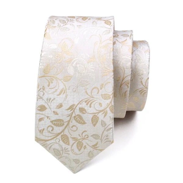 White Gold Floral Tie with Matching Pocket Square & Cufflinks