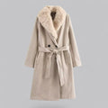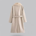 Women’s Beige Double-Breasted Trench Coat with Faux Fur Collar – Belted Longline Design