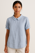 Refined and breathable, this short sleeve blouse combines timeless elegance with effortless summer wear. Designed with a delicate Peter Pan collar and a relaxed structure, it offers a graceful silhouette that’s ideal for warm-weather days. The linen blend construction ensures all-day comfort with a naturally airy feel, making it a versatile piece for both casual and polished settings.