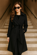 A classic outerwear piece that effortlessly combines elegance and practicality, this longline trench coat is designed for a refined silhouette. The structured shoulders and double-breasted front offer a tailored edge, while the belted waist cinches for a flattering fit. Finished with adjustable cuff straps and a flowing hemline, it delivers both sophistication and ease for any occasion.