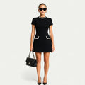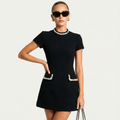 A refined silhouette with a playful edge, this mini dress is adorned with pearl accents along the neckline and pocket openings for a polished finish. The clean structure creates a flattering shape, while the short sleeves and above-the-knee hemline offer a fresh, modern feel. Functional pockets add an element of ease, making it as practical as it is chic.