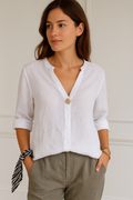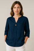 Designed for warm, sunny days, this airy blouse features a flattering V-neckline and a subtle button accent that adds a refined touch. The relaxed silhouette offers freedom of movement and a breezy feel, making it an effortless choice for casual summer dressing. Ideal for keeping cool while maintaining a polished look.