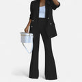 Design: Double-breasted blazer with gold-tone buttons and matching flared trousers