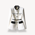 Timeless and tailored, this tweed blazer features a structured feminine cut, elevated with gold-tone buttons and velvet-trimmed flap pockets. The stand-up collar and soft lining offer both polish and comfort, making it an elegant staple for business settings or elevated everyday dressing.